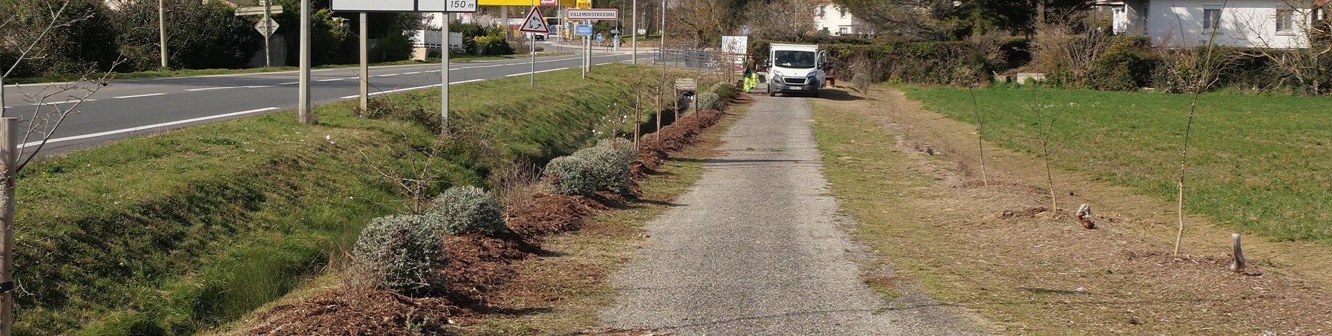 Cette portion de chemin piétonnier, fera, très prochainement, partie intégrante de la future voie verte qui permettra de rallier les communes de Carcassonne, Villemoustaussou et Villegailhenc.