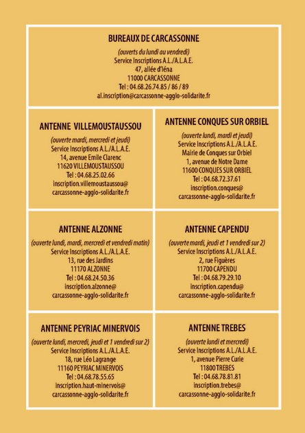 Pour inscrire votre enfant, vous pouvez effectuer votre réservation directement en ligne via le Portail Famille à l’adresse suivante https://portalssl.agoraplus.fr/carcassonne/pck_home.home_view# ou contactez l’antenne de Villemoustaussou au 04.68.25.02.66 (le mardi, mercredi et jeudi de 9h00 à 12h00 et de 13h30 à 17h00), les personnes ayant pris rendez-vous seront prioritaires.