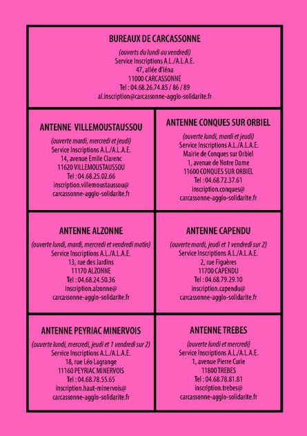 Si vous souhaitez inscrire votre enfant, vous pouvez effectuer une réservation en ligne sur le portail famille https://portalssl.agoraplus.fr/carcassonne/pck_home.home_view#/ ou contactez l’antenne de Villemoustaussou au 04.68.25.02.66 (le mardi, mercredi et jeudi de 9h00 à 12h00 et de 13h30 à 17h00) ou par courriel inscription.villemoustaussoucarcassonne-agglo-solidaritefr.