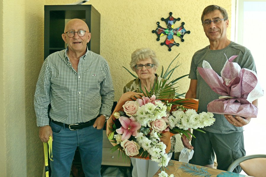 Pour cette occasion si particulière, les Adjoints Délégués, Michel GUIRAUD et Roger LORION, se sont rendus chez sa fille Martine, ancienne élue à la municipalité, pour lui souhaiter un très bel anniversaire et lui offrir un bouquet de fleurs et quelques douceurs.