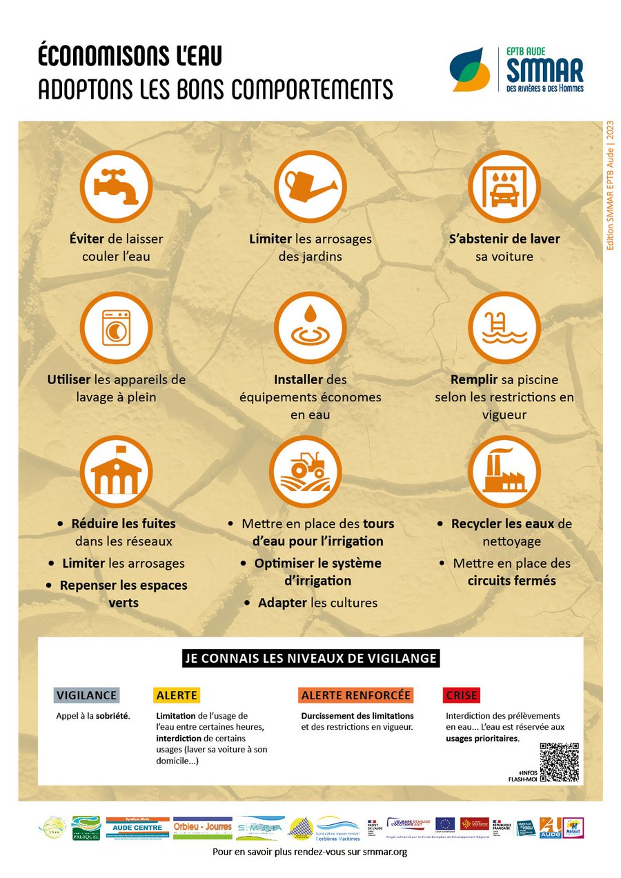 La sècheresse est un enjeu majeur sur notre bassin versant de l’Aude, de la Berre et du Rieu. Les causes sont multiples : le dérèglement climatique, l’urbanisation, l’agriculture et l’industrie entrainent la réduction des réserves d’eau tandis que les besoins augmentent avec la croissance de la population. Pour ne pas être à sec, il est important de veiller à économiser l’eau dans tous ses usages. Ensemble, en adoptant quelques gestes simples, nous pouvons agir et réduire nos consommations afin de préserver la ressource en eau tout en réalisant des économies significatives.