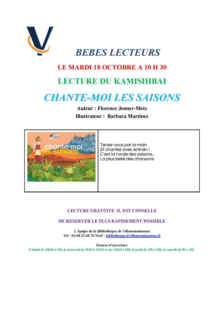 Séance de lecture gratuite, le nombre de places étant limité, veuillez réserver au 04.68.25.48.76 ou par mail à bibliothequevillemoustaussoufr