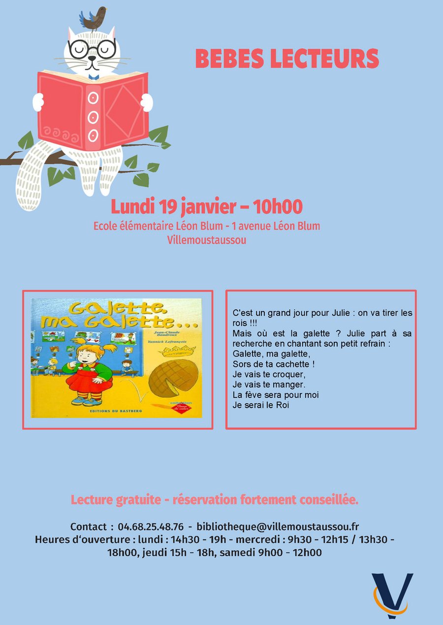 L’équipe de la bibliothèque municipale est ravie de vous retrouver pour le premier atelier des Bébés Lecteurs de l’année, lundi 19 janvier à 10h00, à l’école élémentaire Léon BLUM.