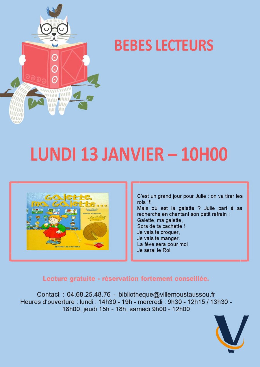 Pour ce premier atelier des bébés lecteurs 2025, Nahla vous propose la lecture de « GALETTE, MA GALETTE… » de Jean-Claude BAUDROUX et Yannick LEFRANÇOIS, le lundi 13 janvier à 10h, à la bibliothèque municipale. Elle vous racontera l’histoire de la petite Julie, impatiente de tirer les rois mais dont la galette a disparu !! Aidez Julie à retrouver la galette en chantant son refrain.
