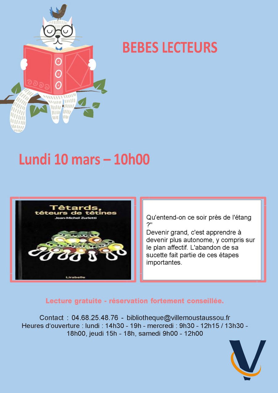 Lundi 10 mars, les tout-petits ont rendez-vous à 10h00, à la bibliothèque municipale, pour un nouvel atelier des bébés lecteurs.