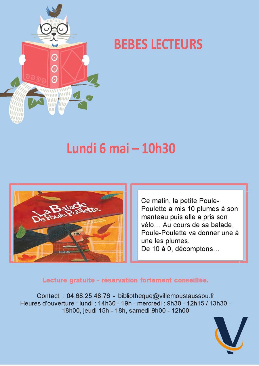 Le prochain atelier des bébés lecteurs aura lieu le lundi 06 mai à 10h30, à la Bibliothèque Municipale. Pour cette nouvelle séance, Nahla a choisi de vous présenter l’album « LA BALADE DE POULE POULETTE » de France QUATROMME.