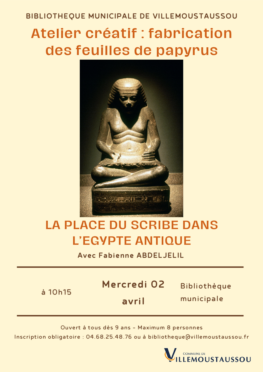 Dans le cadre d'une animation thématique sur "La place du scribe dans l'Egypte Antique", la bibliothèque municipale vous propose de participer à un atelier créatif de fabrication de feuilles de papyrus, le mercredi 02 avril à 10h15.