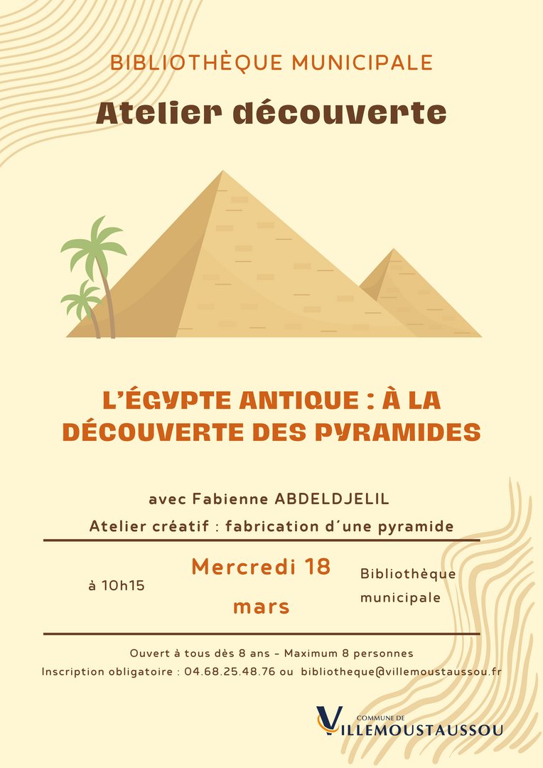 Mercredi 18 mars à 10h15, à la bibliothèque municipale, venez explorer les mystères des pyramides égyptiennes, ces monuments colossaux érigés à la gloire des pharaons.