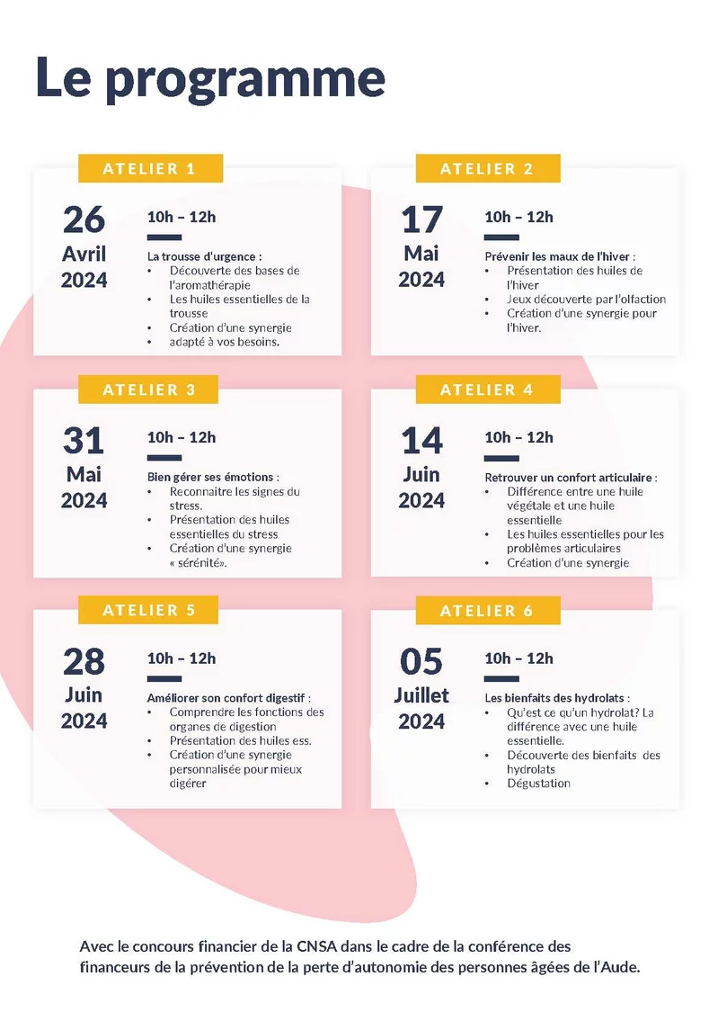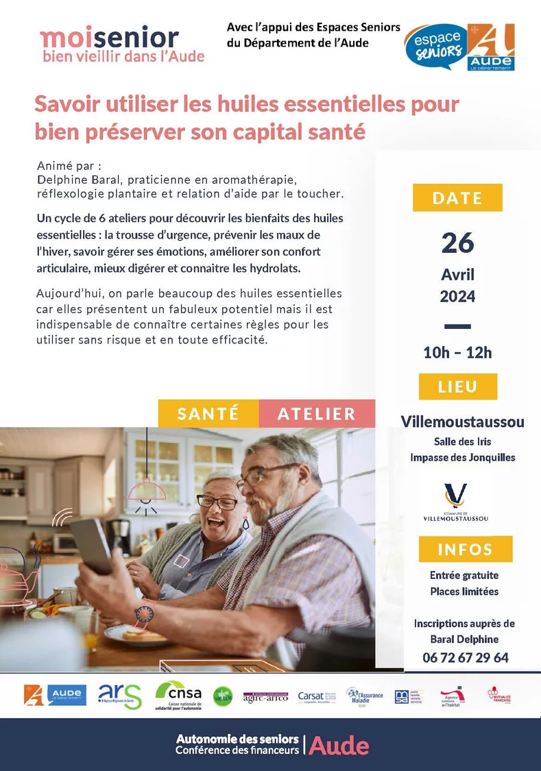 Dans le cadre du programme de prévention #moisenior destiné aux personnes de 60 ans et plus, la municipalité vous propose un cycle de 6 ateliers pour découvrir les bienfaits des huiles essentielles.