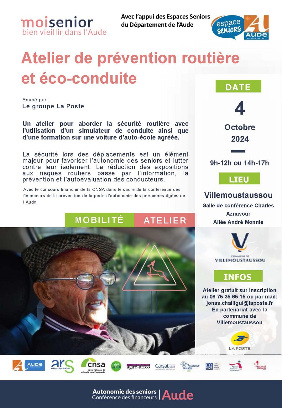La commune de Villemoustaussou, en partenariat avec La Poste et à l’initiative du Conseil Départemental de l’Aude, met en place gratuitement deux ateliers de Prévention Routière et d’éco-conduite à destination des plus de 60 ans, le vendredi 04 octobre de 09h à 12h et de 14h à 17h, salle de conférence, Espace Charles AZNAVOUR.