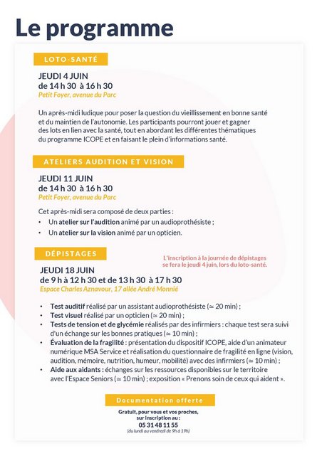 JEUDI 18 JUIN - 09h à 12h30 et 13h30 à 17h30 - salle Convivialité de l’Espace Charles Aznavour : une journée de dépistage pour bénéficier de tests simples et évaluer six fonctions essentielles telles que la vision, l’audition, la mémoire, la nutrition, la mobilité ou encore l’humeur.