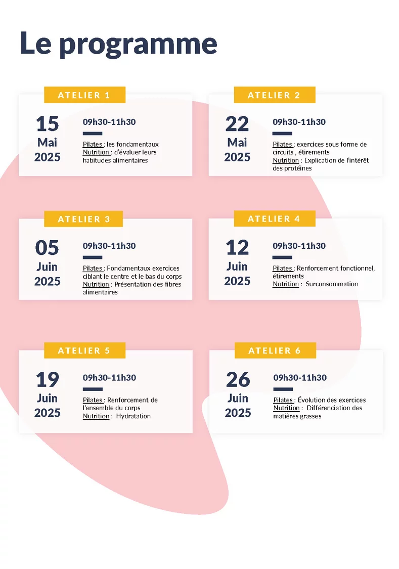 Chloé BLANDINIERES, diététicienne et éducatrice sportive et Mickaël DUPUIS, éducateur sportif, vous accompagneront durant 6 séances et vous donneront les clés pour améliorer votre bien-être au quotidien.