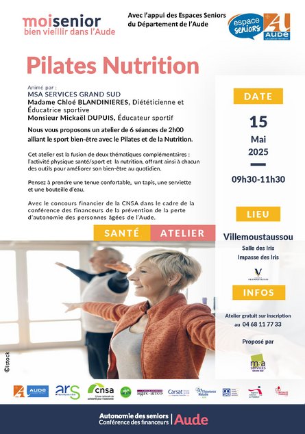 La commune de Villemoustaussou, en partenariat avec la MSA services Grand Sud et à l’initiative du Conseil Départemental de l’Aude, met en place GRATUITEMENT, des ateliers « PILATES ET NUTRITION » destinés aux personnes de plus de 60 ans.