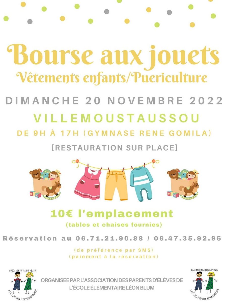 L’Association des Parents d’Élèves de l’école Léon Blum organise sa traditionnelle Bourse aux Jouets, vêtements enfants et articles de puériculture, le dimanche 20 novembre 2022 de 09h à 17h au gymnase René GOMILA.