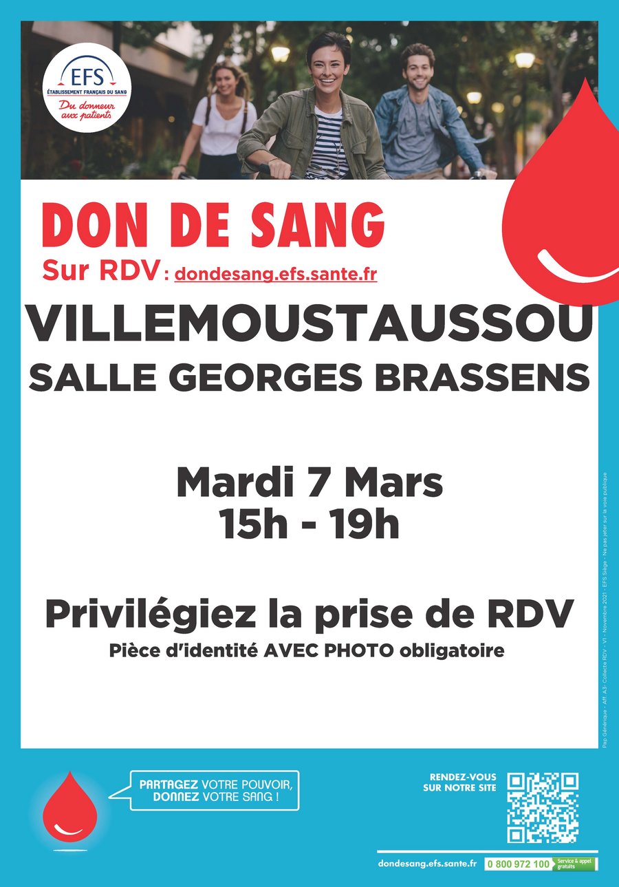 La prochaine collecte de sang se déroulera le mardi 07 mars de 15h à 19 h salle G. Brassens.