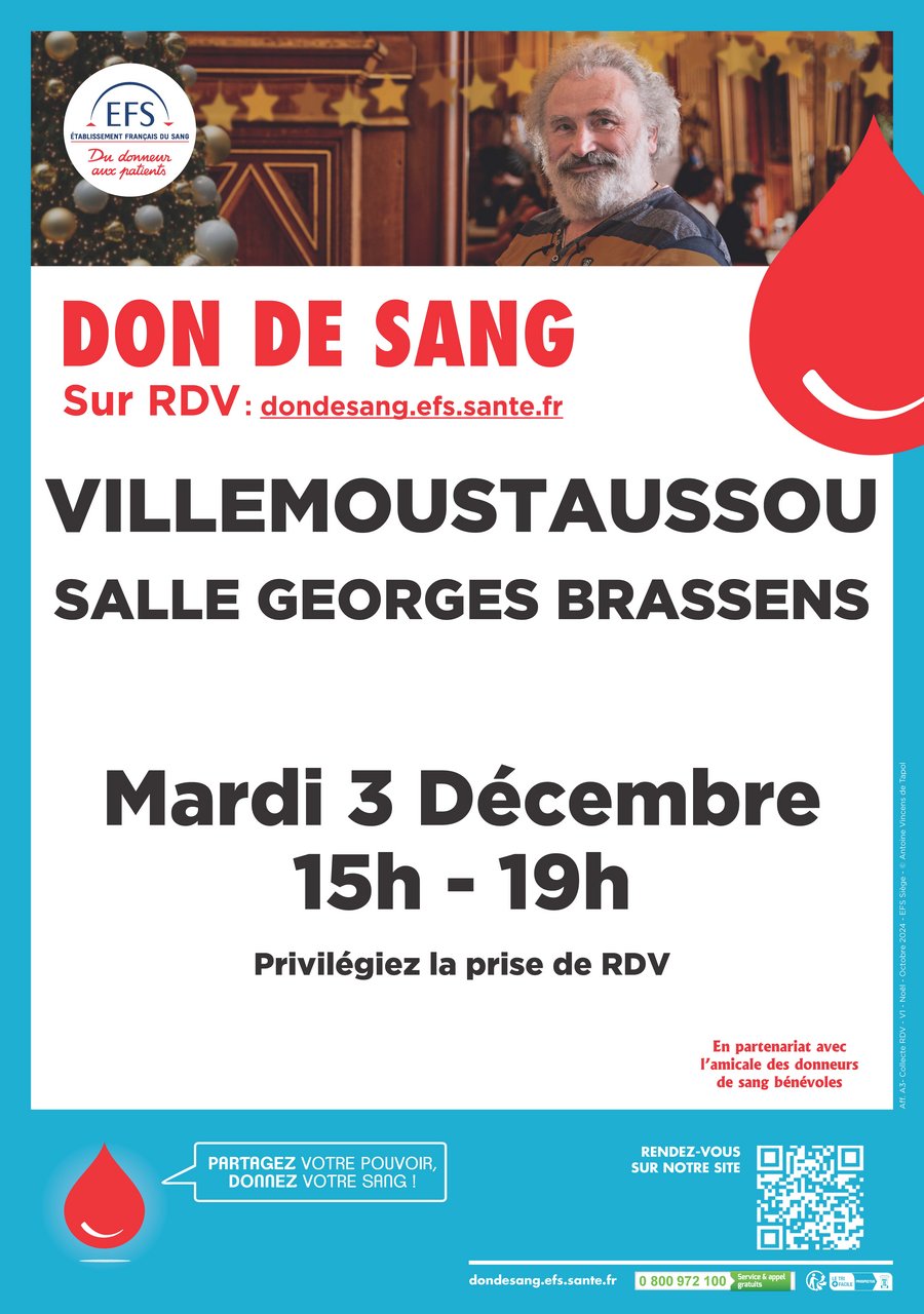 Les périodes de fêtes sont généralement synonymes de baisse de dons et de stocks alors que les besoins en sang restent constants. Restez mobilisés et faites un geste solidaire en donnant votre sang, lors de la prochaine collecte, le MARDI 03 DÉCEMBRE, de 15h à 19h, salle Georges BRASSENS.