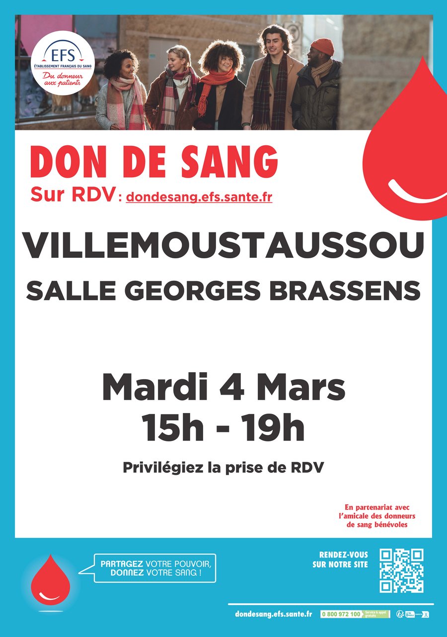 Faites preuve de solidarité en donnant votre sang, lors de la prochaine collecte, le mardi 04 mars 2025, de 15h à 19h, salle Georges BRASSENS.