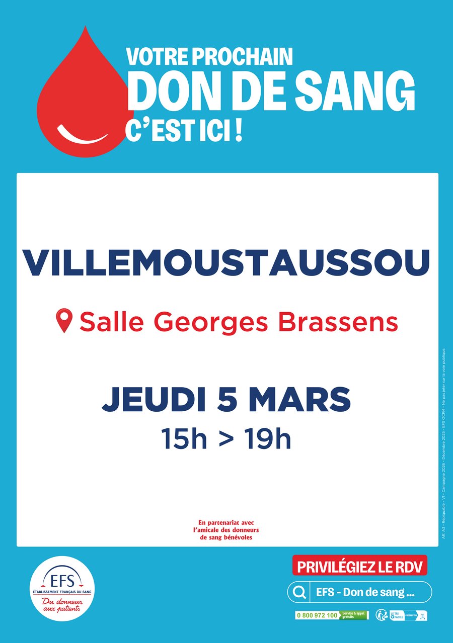 La prochaine collecte de sang aura lieu JEUDI 05 MARS, de 15H à 19H, salle Georges BRASSENS.