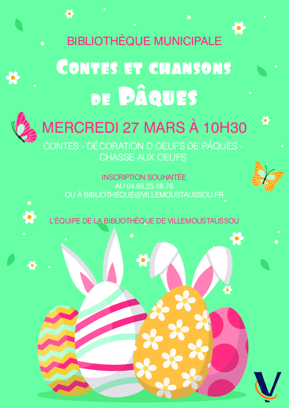 Nahla vous propose une animation sur le thème de Pâques, le mercredi 27 mars à 10h30 à la bibliothèque municipale. Au programme : lecture de contes, chansons, décoration d’œufs de Pâques et chasse à l’oeuf.