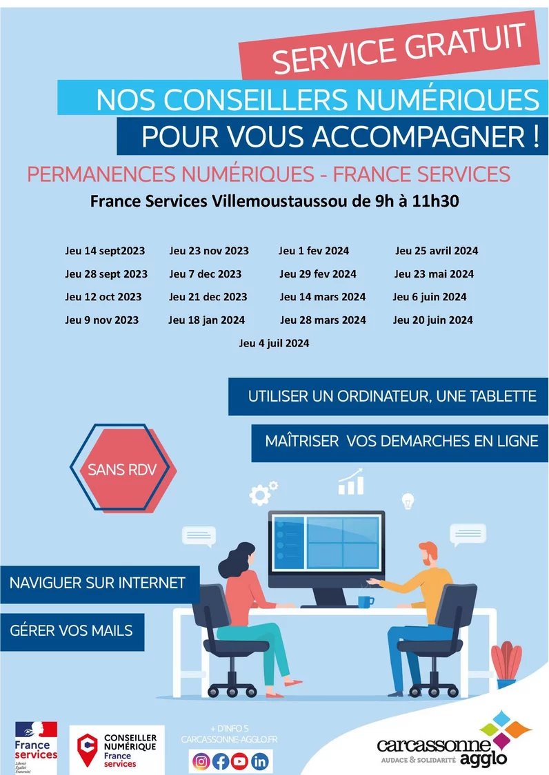 Des conseillers numériques assureront des permanences jusqu’au mois de juillet 2024, dans les locaux de la Maison France Services de Villemoustaussou, afin de permettre aux citoyens qui le souhaitent d’acquérir une plus grande autonomie numérique :