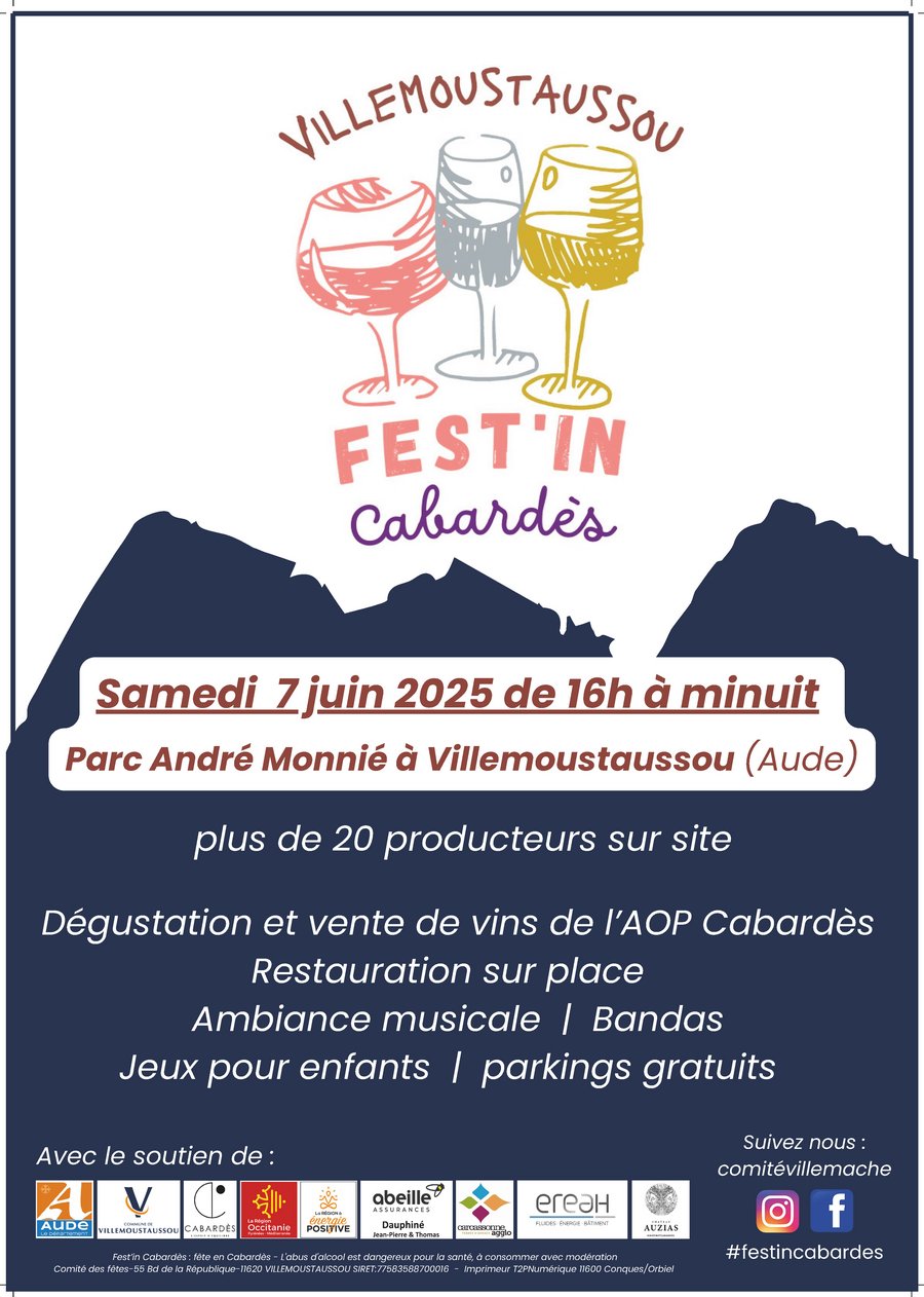 Le Comité des Fêtes de Villemoustaussou met à l’honneur les richesses gastronomiques et viticoles de notre territoire à l’occasion du Fest’in Cabardès qui se déroulera le SAMEDI 07 JUIN, de 16h à minuit au Parc André MONNIÉ.