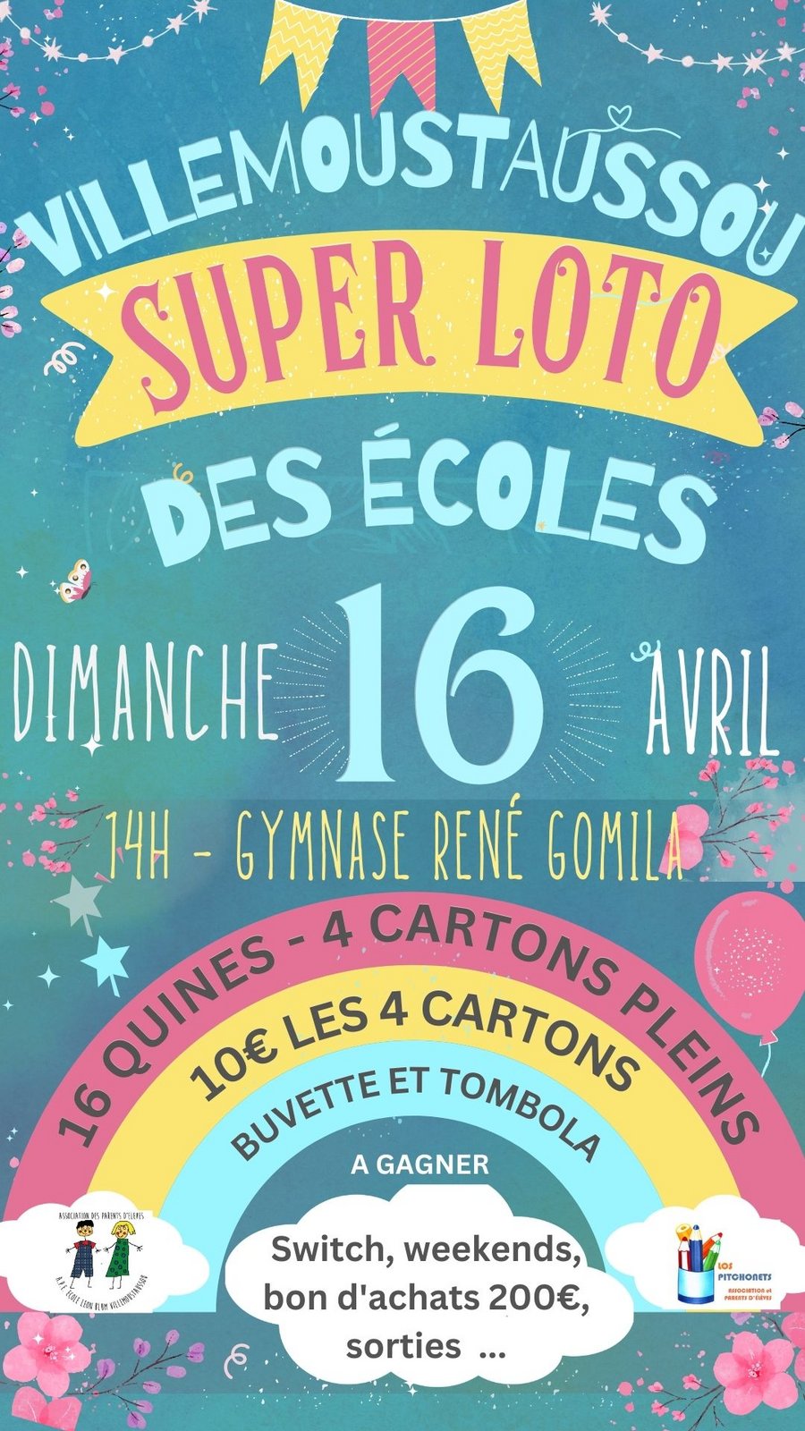Les membres des associations de parents d’élèves du village organisent un grand loto inter-écoles le dimanche 16 avril 2023 à 14h (ouverture des portes à partir de 13h30), au gymnase René Gomila.