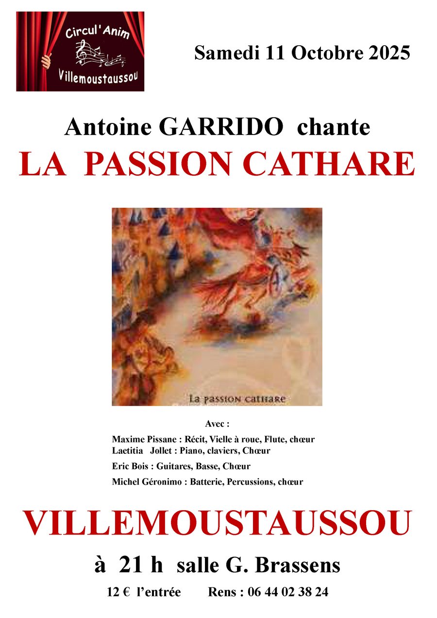 Avec son spectacle « LA PASSION CATHARE », Antoine GARRIDO vous invite à un voyage historique et musical, SAMEDI 11 OCTOBRE à 21h00, salle Georges BRASSENS.
