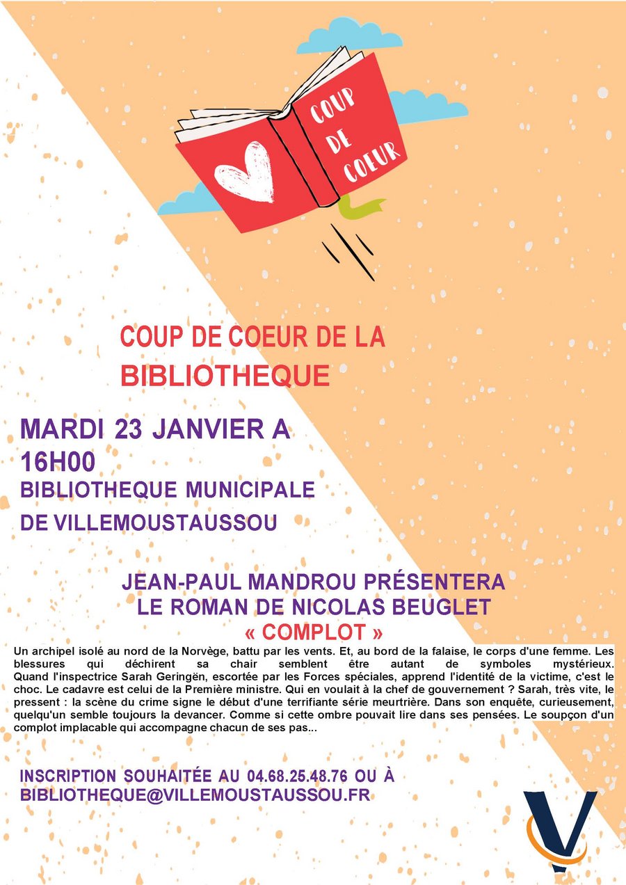 Venez partager le roman Coup de Cœur de Jean-Paul MANDROU intitulé « Complot » de Nicolas BEUGLET, et échangez vos impressions, lors d’une rencontre en toute convivialité le mardi 23 janvier à 16h, à la bibliothèque municipale.