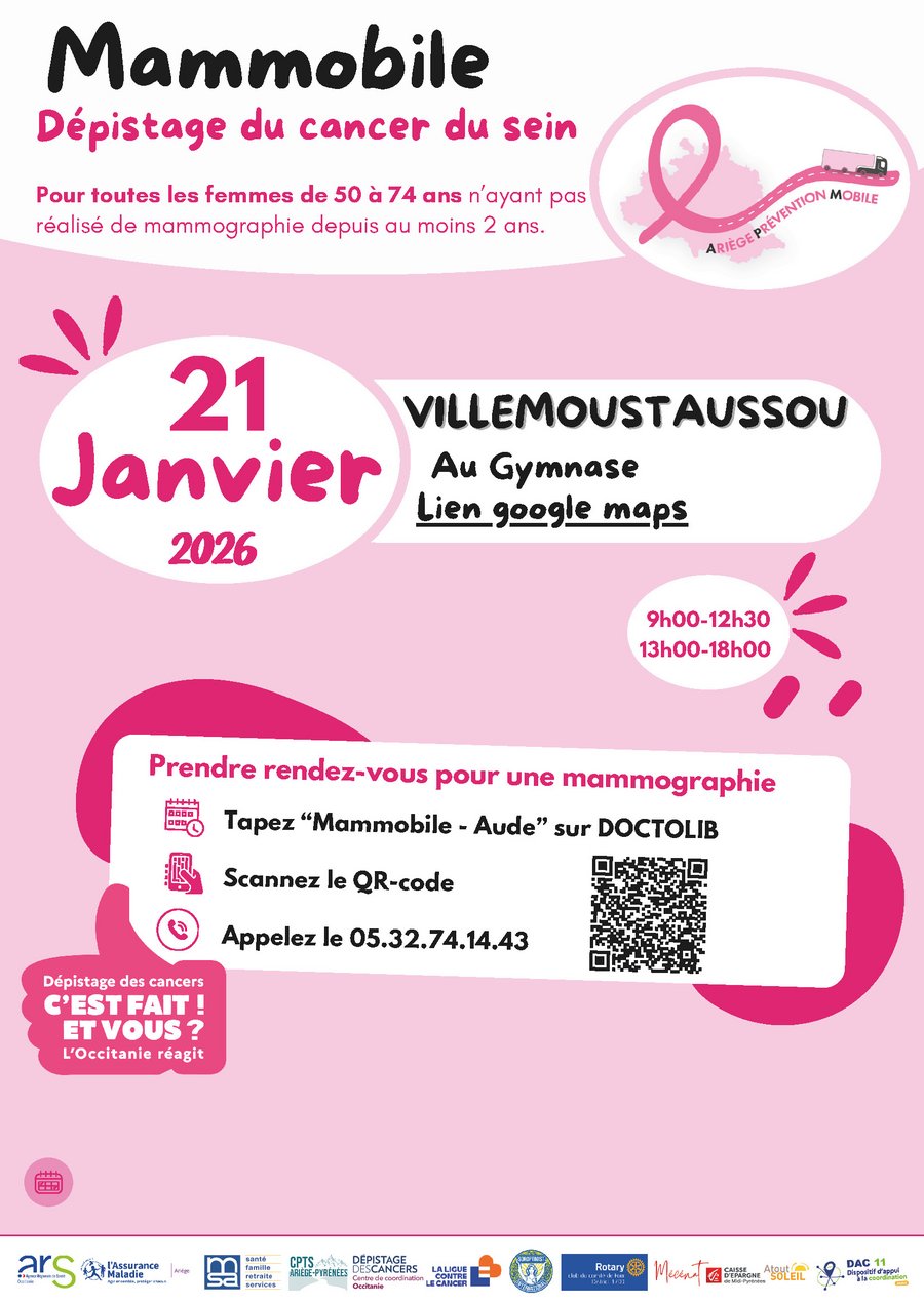Afin de promouvoir la prévention des cancers pour les habitants du territoire, le MAMMOBILE, unité de dépistage mobile du cancer du sein de l’Association Ariège Prévention Mobile, en partenariat avec l’ARS Occitanie, sera présent à Villemoustaussou