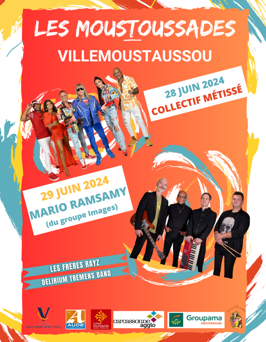 Vendredi 28 juin : 19h : ouverture des festivités et lâcher de colombes par les élèves de l’école Léon Blum ; 19h30 : arrivée de la flamme des Moustoussades ; 20h15 : le DELIRIUM TREMENS BAND et ses 40 musiciens ; 22h30 : COLLECTIF MÉTISSÉ suivi à minuit des FRÈRES RAYZ.