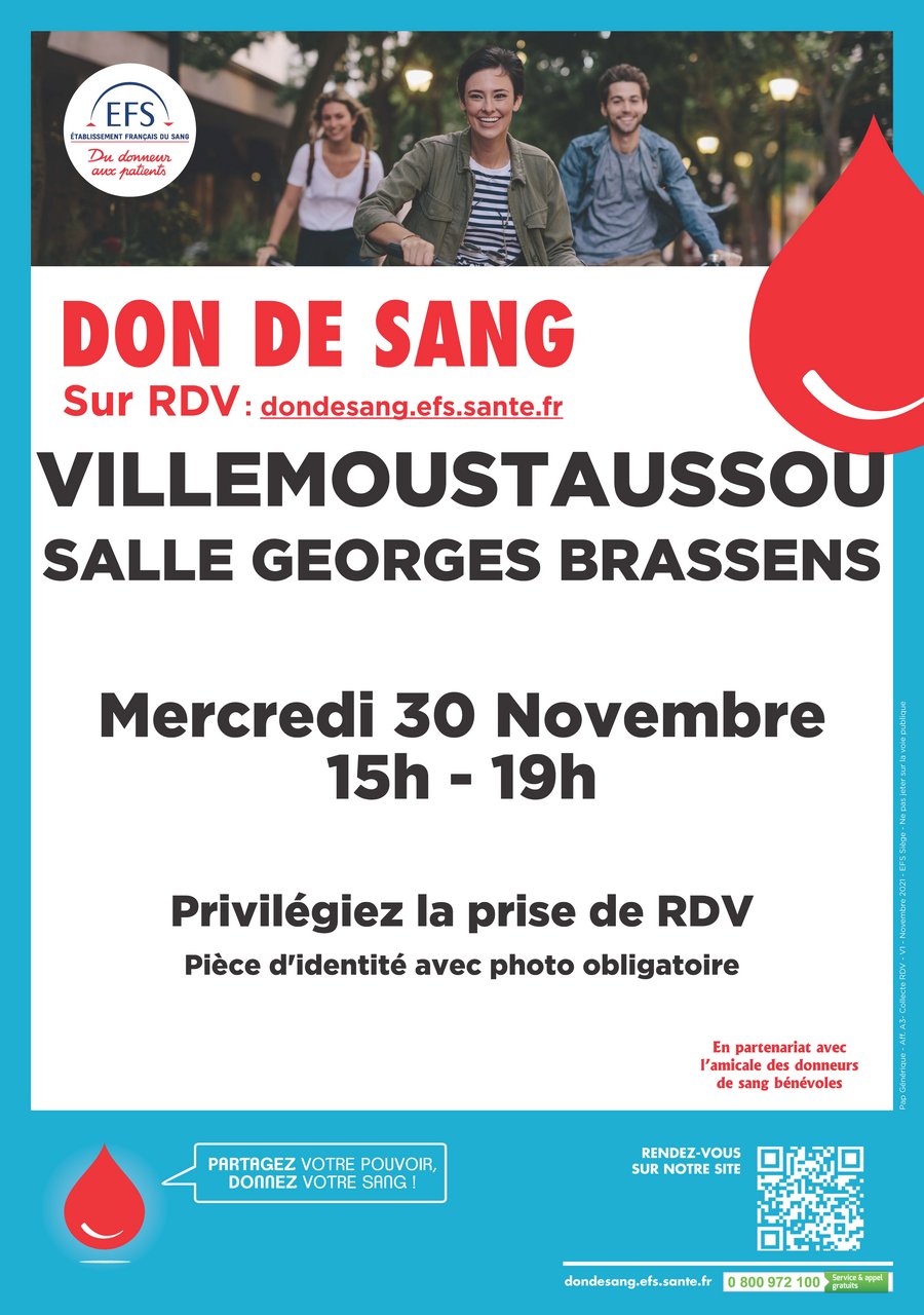 La prochaine collecte de sang aura lieu le Mercredi 30 novembre de 15h à 19h, salle Georges Brassens.
