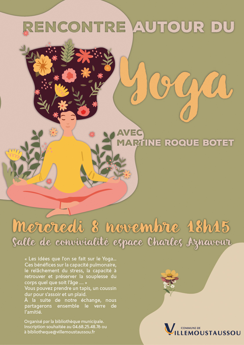 L’équipe de la Bibliothèque Municipale vous propose une rencontre autour du yoga animée par Martine ROQUE BOTET, le mercredi 08 novembre à 18h15, salle de convivialité, Espace Charles Aznavour. Venez découvrir les bienfaits de cette discipline aussi bien sur le corps que sur l’esprit et accessible quel que soit l’âge.