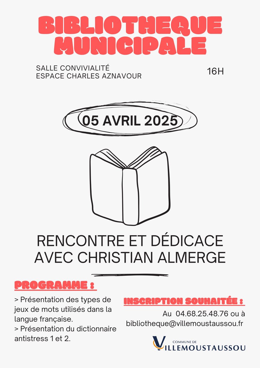 Inscription souhaitée par téléphone au 04.68.25.48.76 ou par mail à bibliothequevillemoustaussoufr
