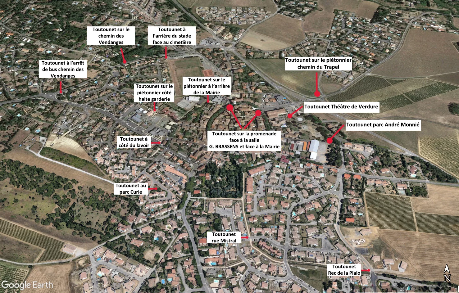Quatorze distributeurs de sachets sont installés afin de ramasser les déjections canines. Localisez-les sur le plan ci-dessous.